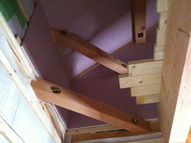 吹き抜けの四方には、本来2階にの床の部分となる高さに火打ち梁が入っています。