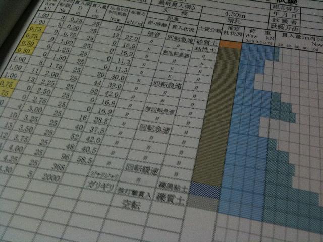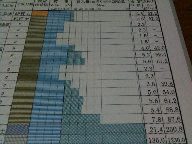 よく話に出てくるN値なんかもいろいろ聞きましたが、2階建ての木造住宅のような比較的軽い建築物の場合は、むしろ抵抗のほとんど無い自沈層といわれる地盤の有無や厚みなどが重要で、単純にN値が3以上(3というのが一般的な基準のようです)だから大丈夫とかそういうわけではないようです。