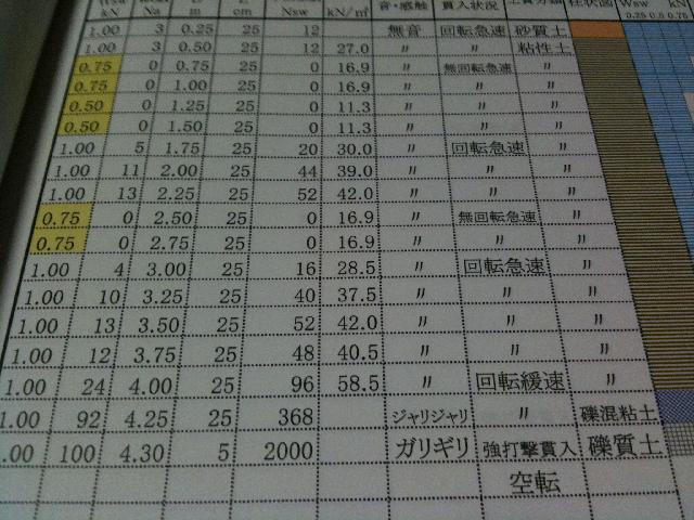 左の黄色く塗りつぶされているところはほとんど抵抗無くずぶずぶ杭が沈んでしまう柔らかい層です。