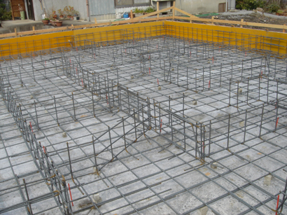 すでに立ち上がりの配筋はなされているので、そこに型枠をはめます。