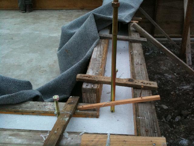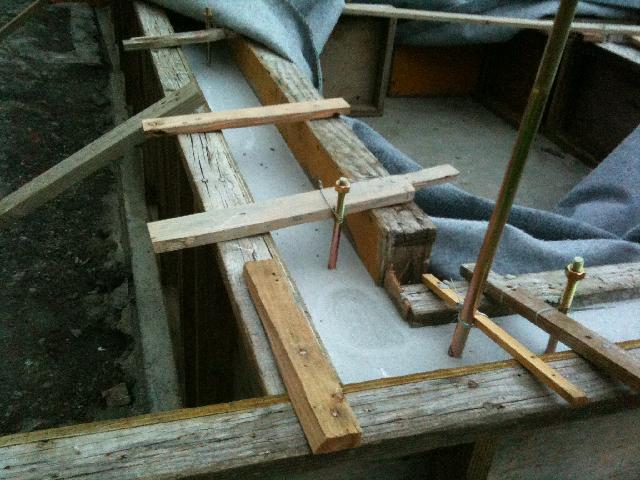 現場の方の話では、ど真ん中に鉄筋があるので、それに固定するように内側に立てているのでどうしても少し寄るという話でした。