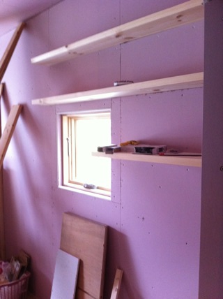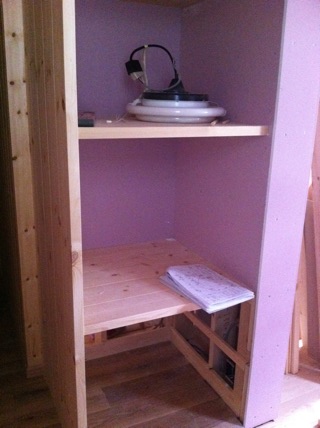 実際作ってみると、棚板の厚み、3センチがカナリ大きく電化製品が入りません。