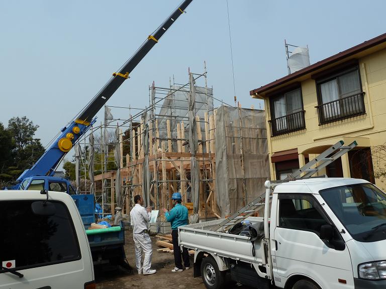 上棟の様子です。手前の白い服のおじさんがRobinの現場監督です。