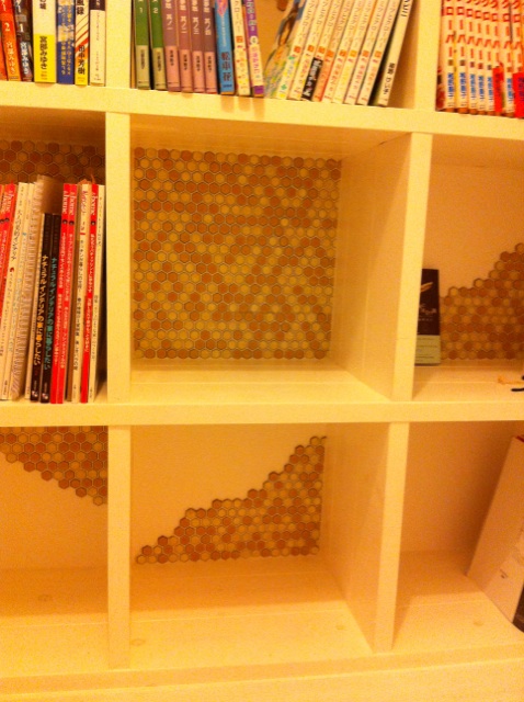 いろいろ、左官屋さんと検討した結果、本棚の内部に張ろうかということに。